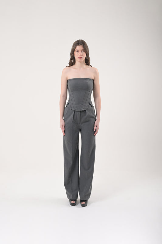 Grey Tailored Top with Brown Pleated Mini Skirt
