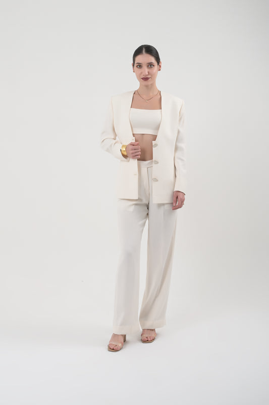 Beige Double-Breasted Tailored Top and Beige Pants Set